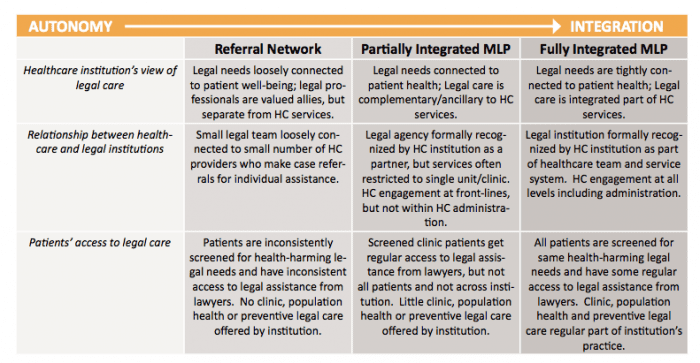 The Milken Institute School of Public Health at George Washington University has established a National Center for Medical-Legal Partnership, that provides information on the health centers & legal organizations that have made such partnerships — as well as best practices & a starter toolkit for those interested in opening a partnership (you just have to complete a short form on their site to download the toolkit).