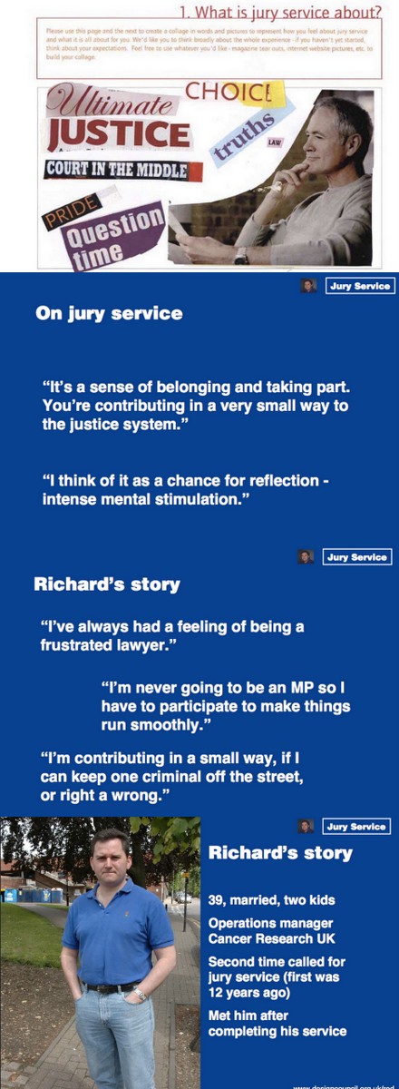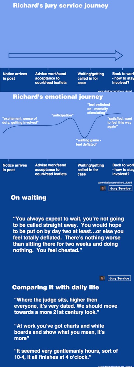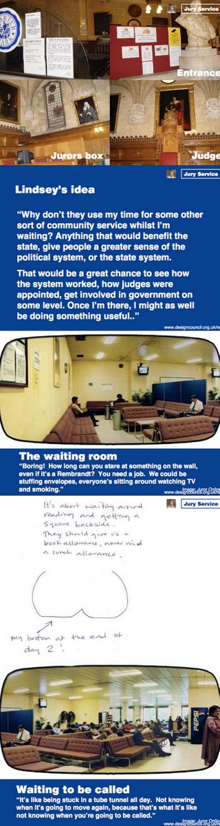 More wonderful insights into how citizens called to be jurors experience the court system in the UK — from the RED project, by the Design Council —read more, http://www.designcouncil.info/mt/RED/citizenship/.