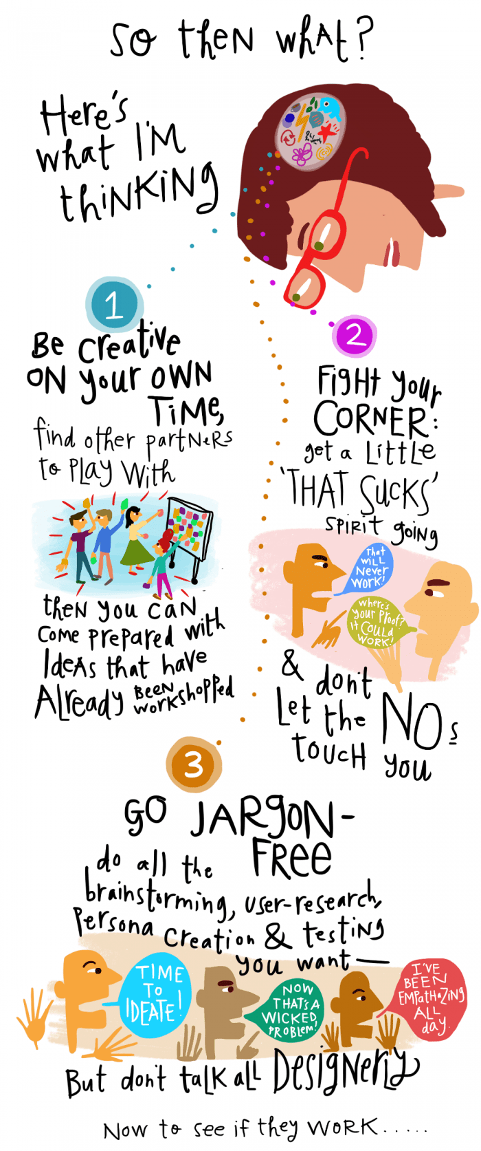 I am a city attorney who has been running design charrettes inside City Hall to break down siloed government and increase creative collaboration among internal stakeholders to solve citizen problems. Many parallels between our work (after all, lawyers historically have played a strong role in setting up our bureaucracies).