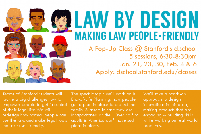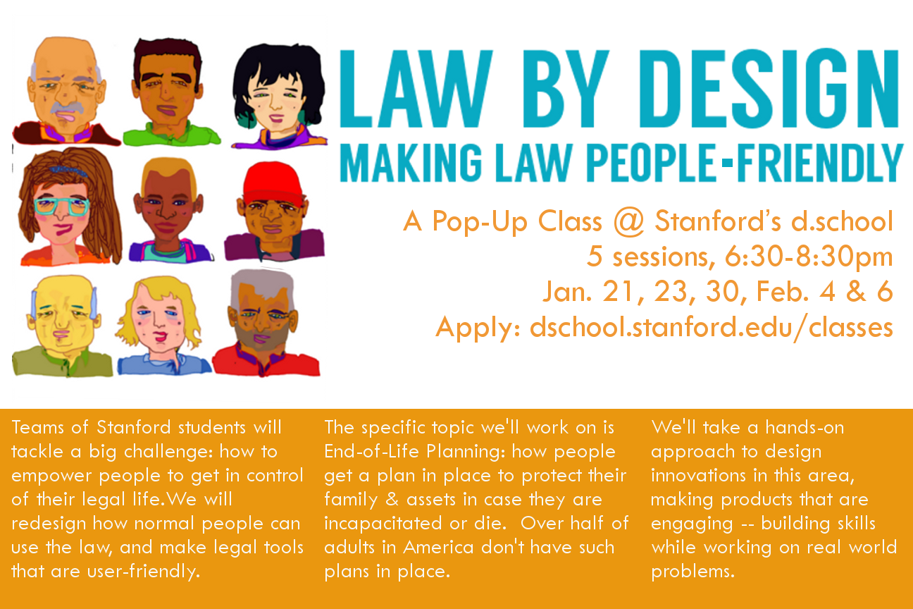 Through the Program for Legal Tech & Design, I’m co-teaching a 5-session class at Stanford’s d.school this January & February. It will be a hands-on session on how to make law more usable to people — and how to help make people law-smart, and in control of their legal futures.