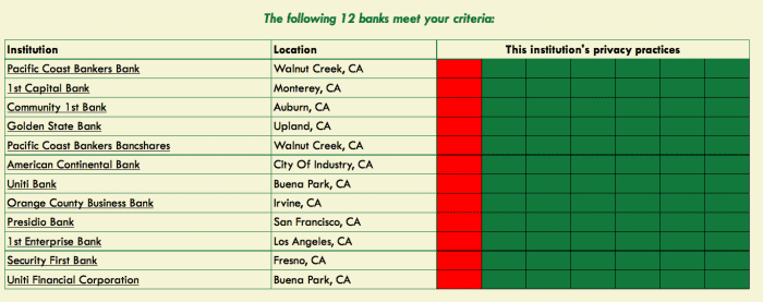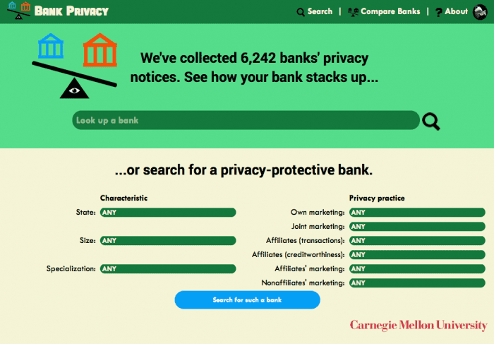 Carnegie Mellon’s CUPS group, who works on making usable privacy projects for normal people, has just launched a new project. They have published a collection of banks’ privacy notices, encoded regarding their privacy practices. You can search for your bank’s policies, and also search for the best bank that fits your privacy preferences.