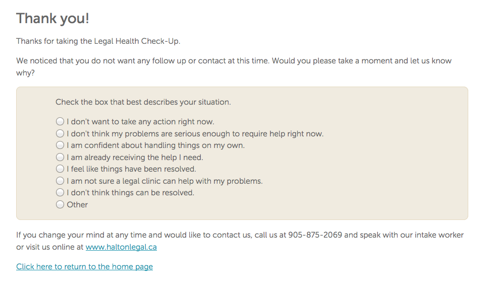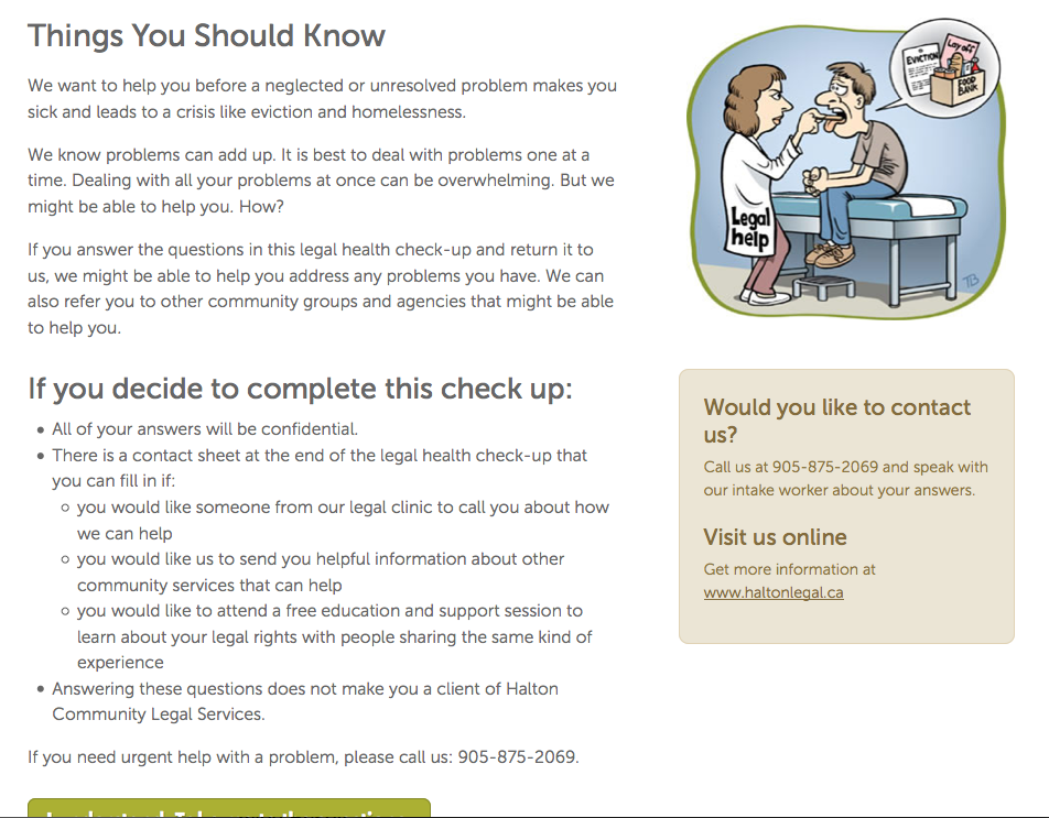 Hi Margaret: thanks for this interesting blog post. Please note that the Halton project (whose website you featured here) is part of a wider initiative to track legal needs and design interventions in four counties in Southwestern Ontario – they will also be conducting research on the findings, to my understanding. There is a lot of interest in this approach throughout Ontario, however… there is some background information about the SW (Halton) project here – http://www.plelearningexchange.ca/resources/legal-health-checks/legal-health-checks-ontario-canada/. There was also a similar interesting initiative in Queensland, Australia which tracked data and outcomes – see this link for more information: http://www.plelearningexchange.ca/resources/legal-health-checks/legal-health-checks-australia/