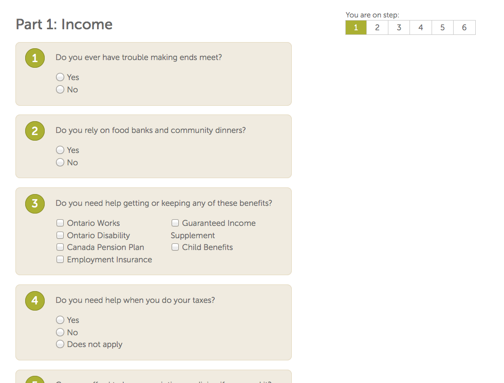 One of the ideas that Briane had was to to have a checklist for different age ranges. The user would be asked the checklist of questions, and then be given a personalized legal risk profile. From there, we could possibly give them contact details for legal services and self-help centers — or well-designed paper-based resources to help them understand what processes and resources are available to them.
