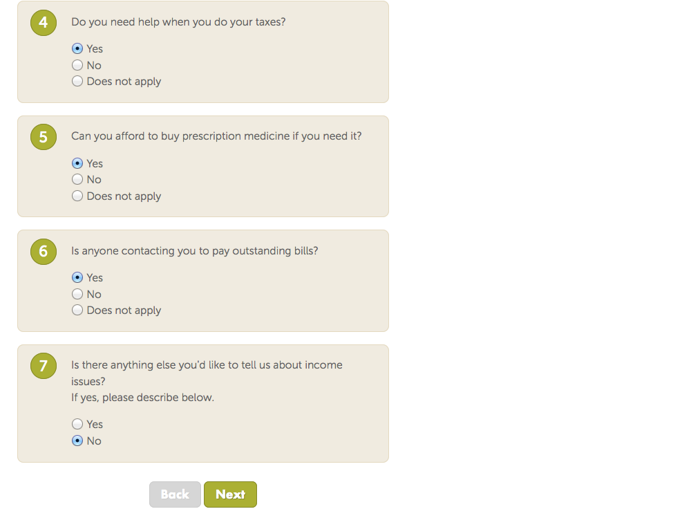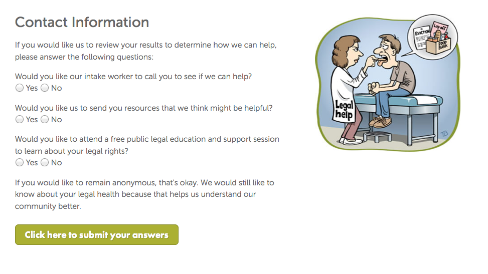 It is an interesting model of intake & of public education. It can be an activation experience, to get people to start thinking of what problems in their life have a legal component — and a possible legal solution. After going through the questions, the site provides some path to follow up & get possible problems taken care of. Presumably, it also is able to send on the user’s profile to a legal clinic, for a relatively warm hand-off to the service provider.