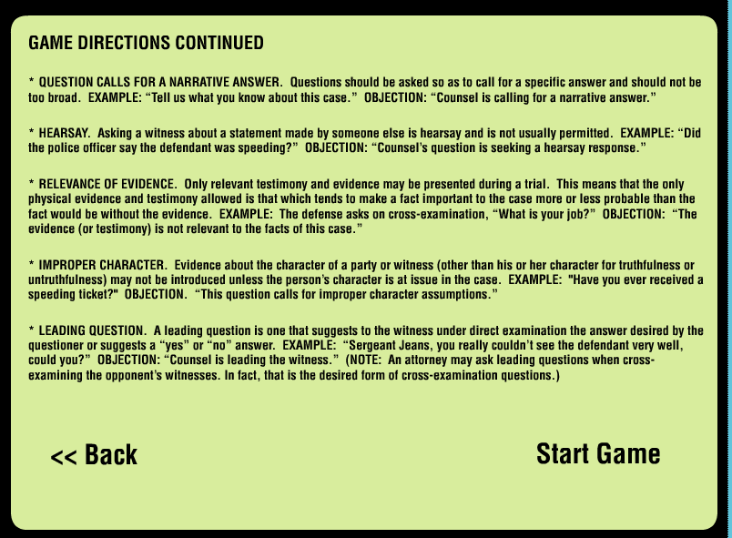 It is a lightweight but very interactive way to learn & test yourself on the rules of evidence. The game, which I’m assuming is a flash-based game, uses striking visuals & simple interactions to immerse the user in a courtroom setting. The player takes on the role of the attorney in a trial. The opposing counsel is asking questions — and you the player have to figure out (1) should you make an objection, and (2) what the basis of the objection should be.
