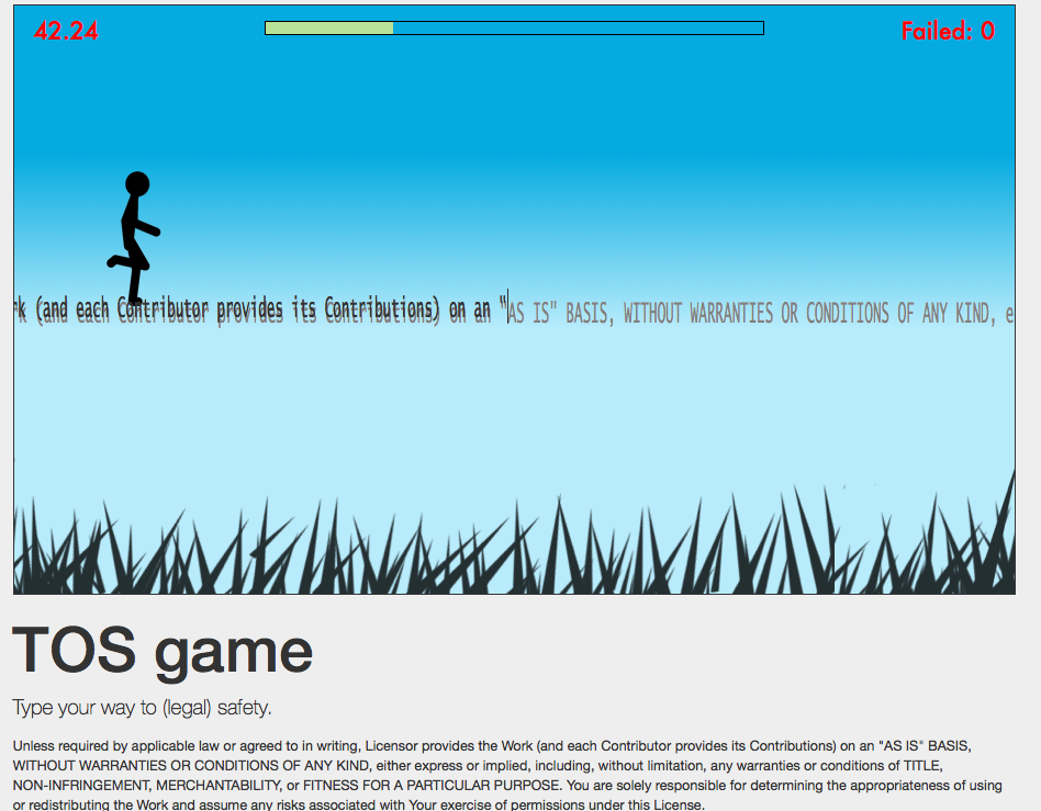 It’s a very simple game: you the user must type contract provisions out correctly, to match the Terms of Service you are presented with.  You must type fast enough and correctly enough that this little running man doesn’t fall of you wall of text.