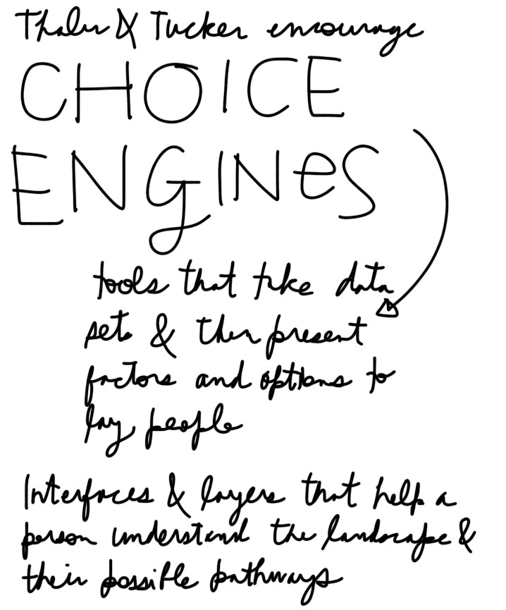 Here are some of my sketched notes from while reading Nudge by Cass Sunstein & Richard Thaler, and then another article by Richard Thaler & Will Tucker in Harvard Business Review on Smarter Information, Smarter Consumers.