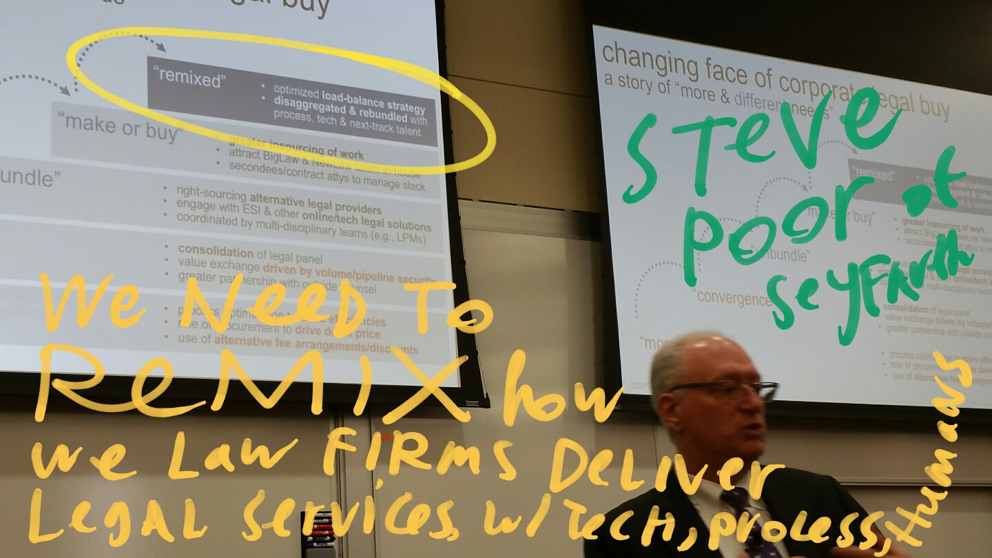 Law firms need to be focused on Legal services as PROCESSES we can redesign, remix – these coreographies of service delivery. We can play with these new processes to change the tech, the staffing, the communications, etc.