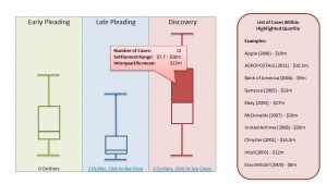 Box plots are another great way to visualize the distribution of settlement sizes. Unlike the first graph, the box plot can show those distributions across an additional axis of data. In this example, distributions of settlements are compared across phases of litigation. Other comparisons may include allegation type, parallel SEC vs. no parallel SEC, IPO / Secondary Offering / Non-IPO cases, etc. To address issues with scale, outlier settlements would be omitted, but a link would be provided at the bottom of each plot to display those omitted outliers. Each portion of the box and whisker can be highlighted to show aggregate data for the cases falling within that quartile, as well as a list of those cases appearing on the right side of the screen.