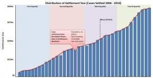 The idea behind this graphic is to allow users to search for a sample of cases (based on any number of criteria), then graph the distribution of settlements within that sample. The background of the chart help to delineate settlement sizes by quartile. In addition to the quartile ranges, a line is drawn to show where the mean settlement value falls within the distribution of cases. Each bar represents a case within the sample, and rolling over any bar provides a snapshot of information about that one specific case. Clicking on the bar will bring a user to that particular case’s page where more detailed information about the case can be discovered.