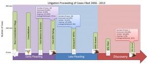 This chart shows the number of cases that reach into later and later phases of litigation, with all cases starting at an initial complaint being filed, and the numbers growing smaller and smaller as a case progresses. Each bar represents an important moment in the litigation process, such as a motion to dismiss being filed or a ruling on a motion for summary judgment. Hovering the cursor over a given bar will pop up breakdown of case status to that point in the litigation proceeding, as well as an average settlement value for cases settling in that range.