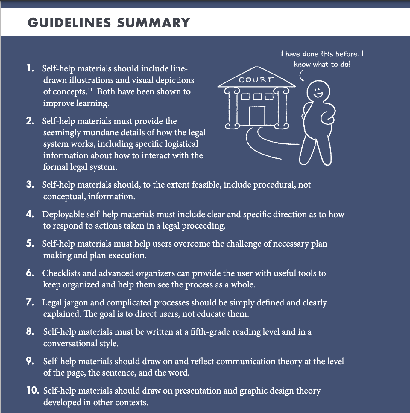 Lois Lupica, working with IAALS and the Bohemian Foundation, made a guide for legal help providers about how to effectively communicate information to the public about the legal system and their rights. At the link, find the pdf of “Guidelines for Creating Effective Self-Help Information” with the guidelines, examples, and more details.