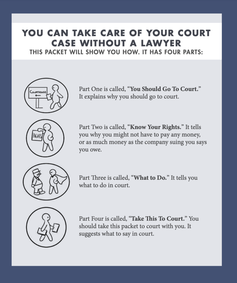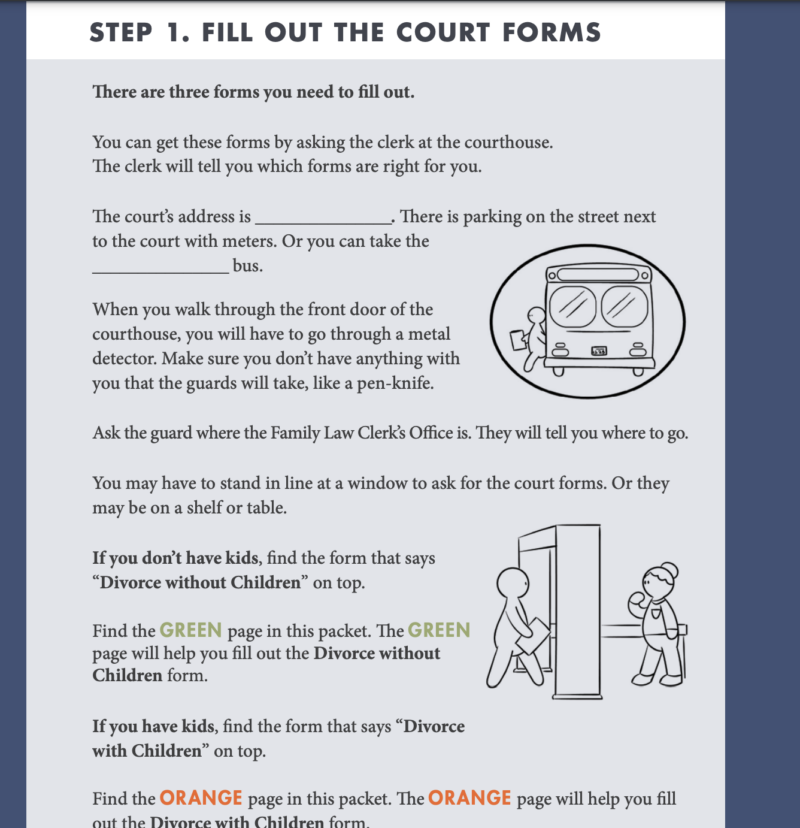 - Self-help materials must provide the seemingly mundane details of how the legal system works, including specific logistical information about how to interact with the formal legal system.